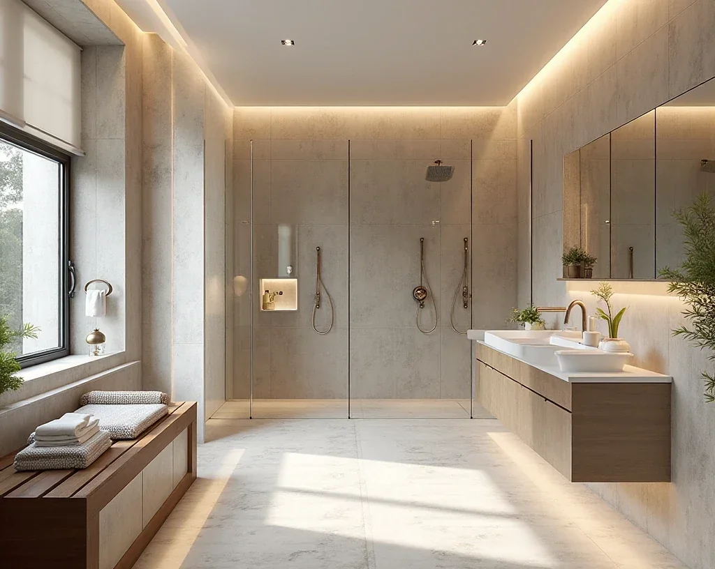 Großformat-Fliesen schaffen ein modernes, ruhiges Raumgefühl mit minimalen Fugen. Sie wirken edel, lassen das Bad größer erscheinen und sorgen für ein harmonisches, luxuriöses Gesamtbild.